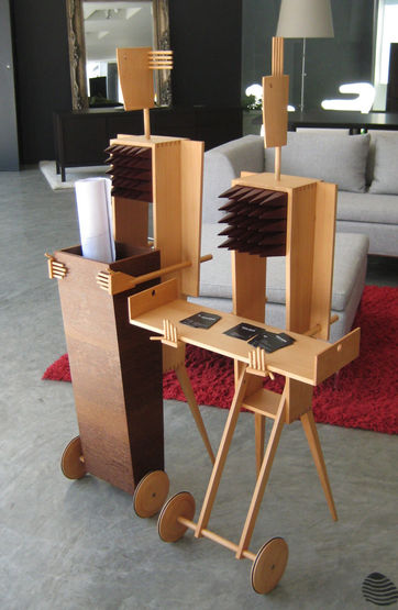 A proposta, partindo da ideia da Figura de Receber, actualiza e redesenha o seu conceito, através de pequenas esculturas em madeira, quer na forma de móveis de apoio, quer na forma de suportes para roupa.
